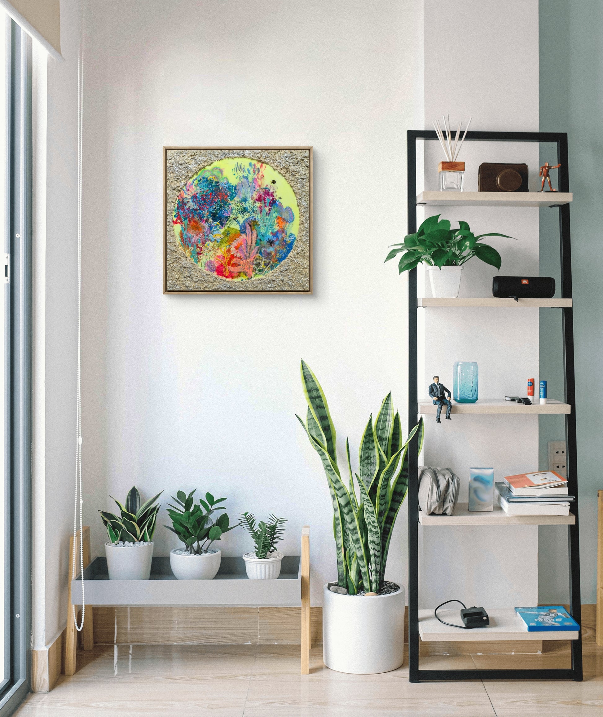I enjoy observing how the many textures, and patterns in nature combine to create stunning scenery. Additionally, experimenting with various color schemes to find which ones work best is a lot of fun. I have used sawdust to create my own texture on canvas to mimic the texture of the corals found underwater. I have used several colors to show the luminous radiance of those corals and the tiny creatures around them.