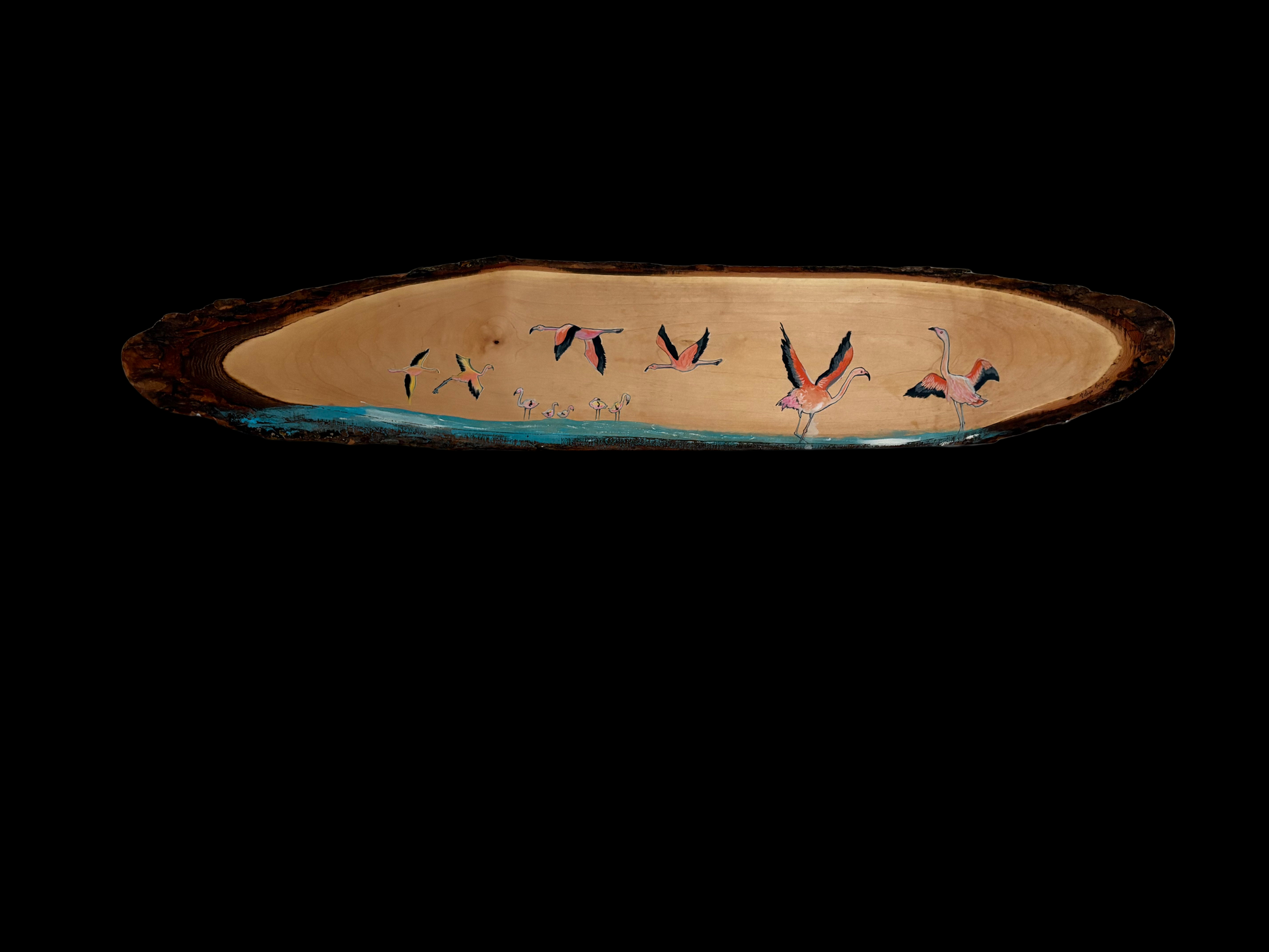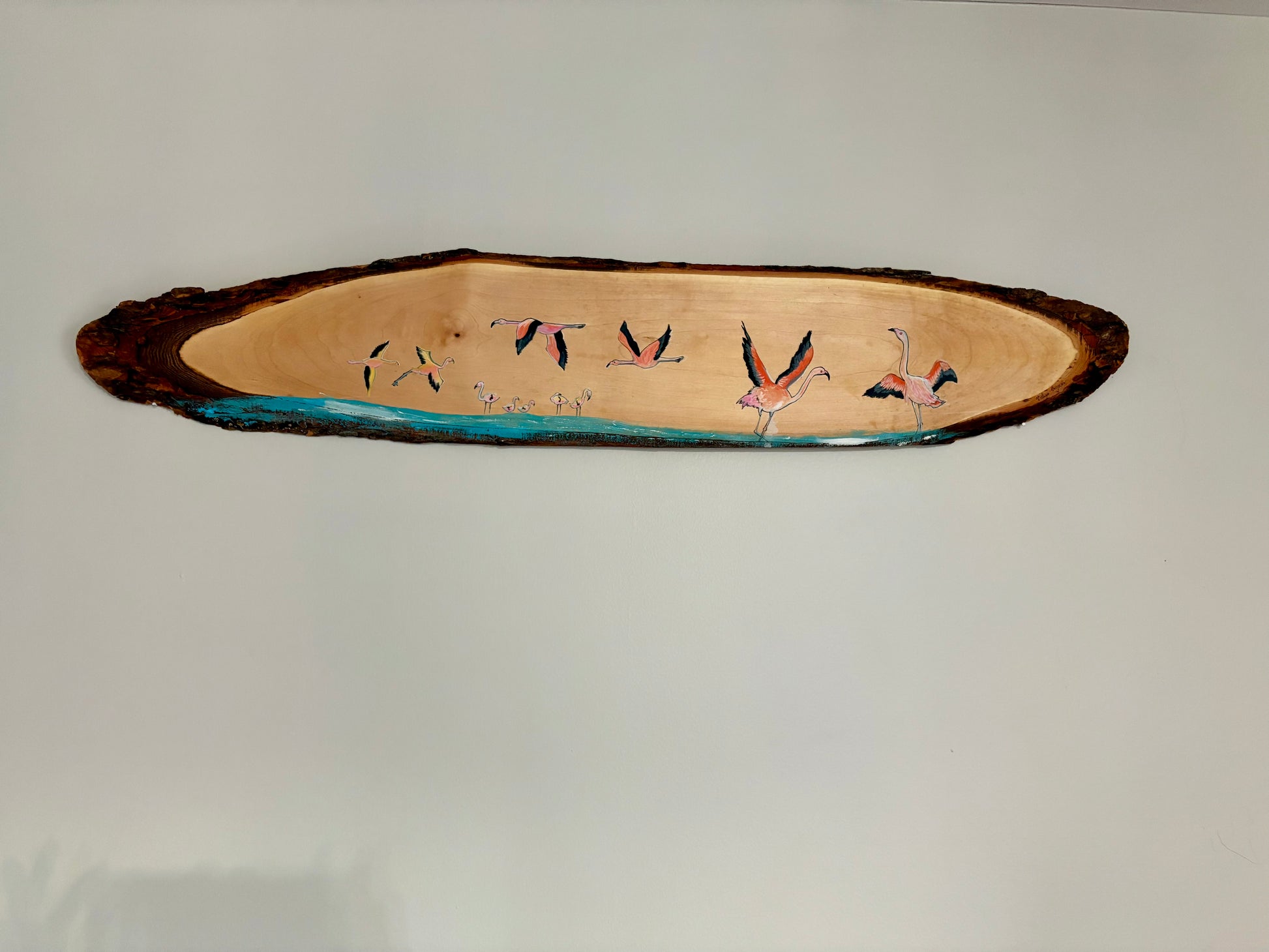 Flamingo birds painted on Live edge Maple wood cut from naturally salvaged trees